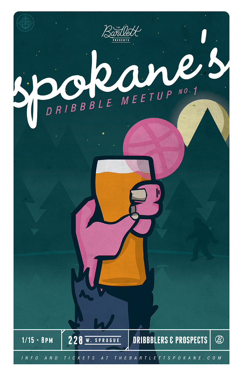 Designed poster and badge to promote Spokane's Dribbble Meet Up no. 1 at the Bartlett in Spokane, Washington.